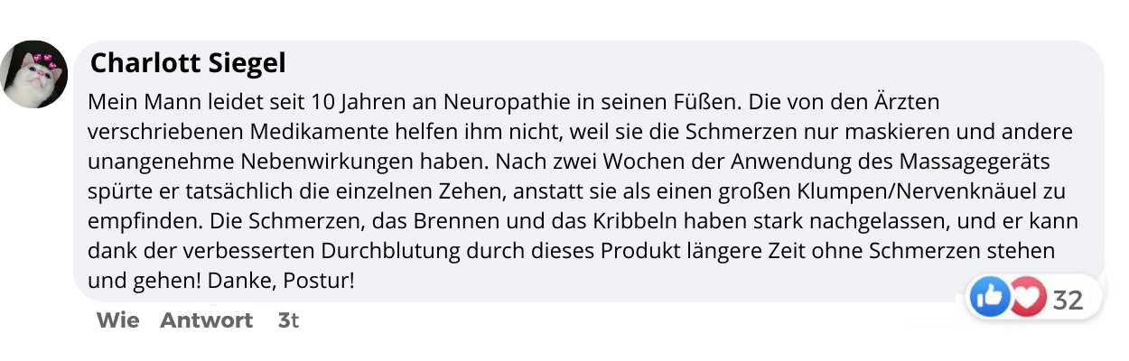Funziona davvero. Dopo averlo usato solo una volta, le caviglie rigide e gonfie hanno smesso di farmi male e sono riuscito a dormire bene. Dopo aver usato di nuovo il massaggiatore plantare Postur al mattino, anche il gonfiore era completamente scomparso. Lo consiglio a chiunque sia seriamente intenzionato a sbarazzarsi del dolore cronico ai piedi e della neuropatia.