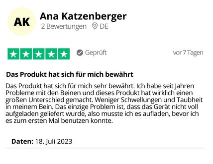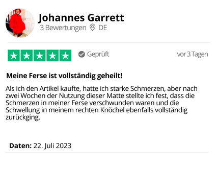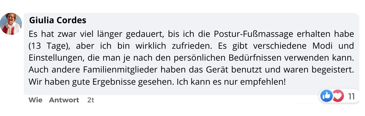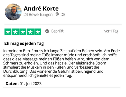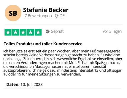 Anwender berichten, dass sie bereits nach der ersten Anwendung eine Erleichterung in ihren Füßen spüren. Je öfter Sie es anwenden und die für Sie beste Intensität einstellen, desto besser werden die Ergebnisse sein.